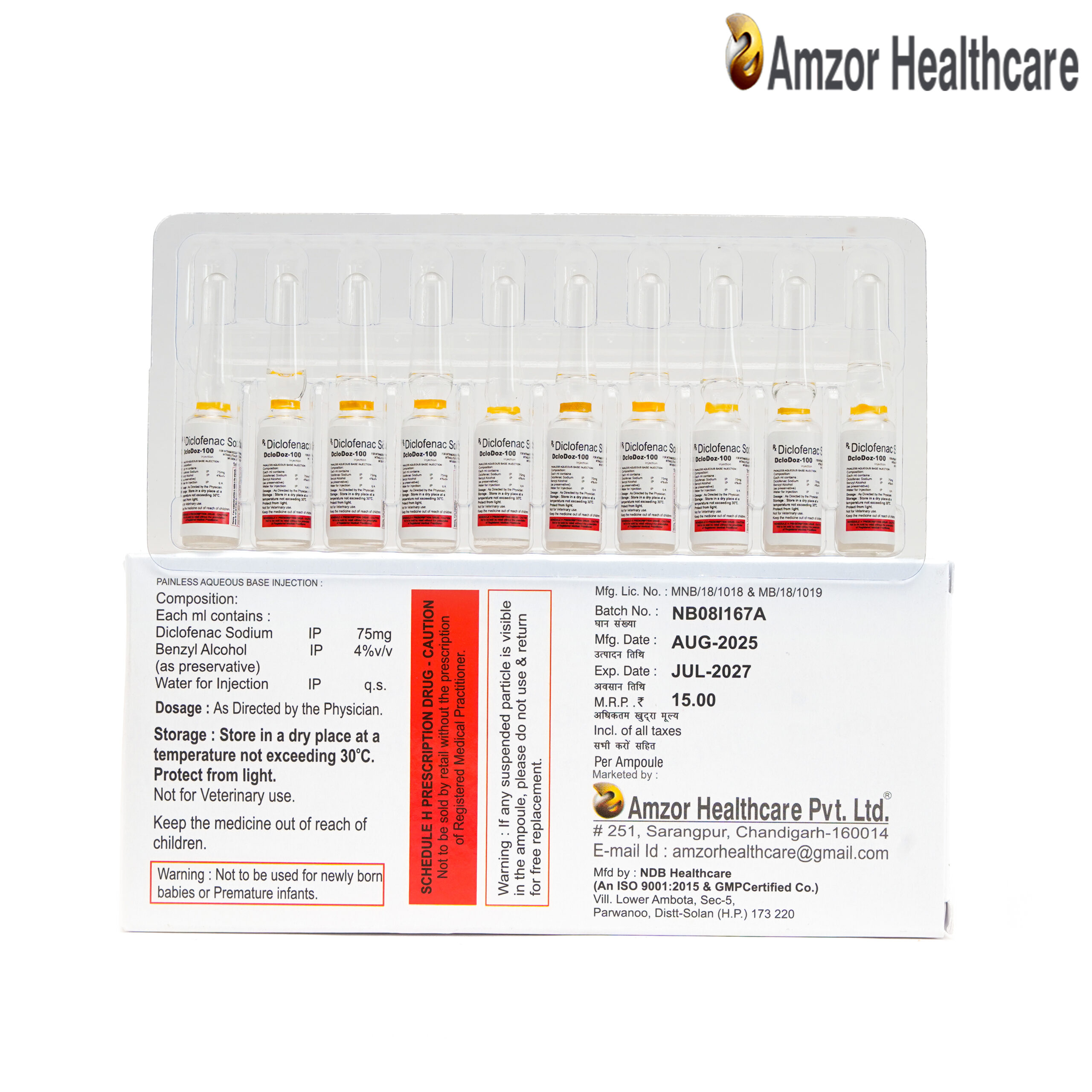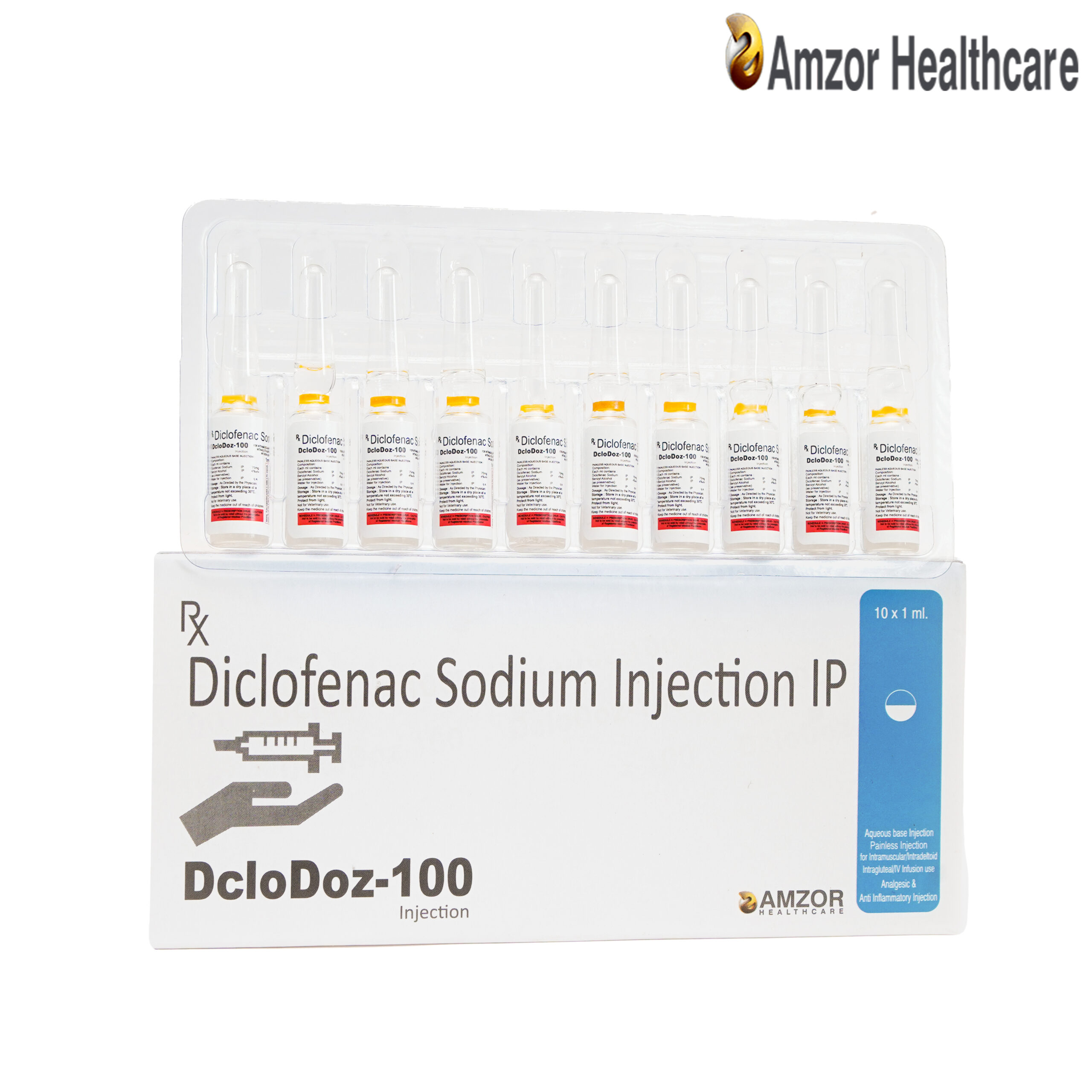 | DCLODOZ-100 | Diclofenac Sodium 75mg/ml | 1ml × 10 Ampoules | Ampoule Pack | — |