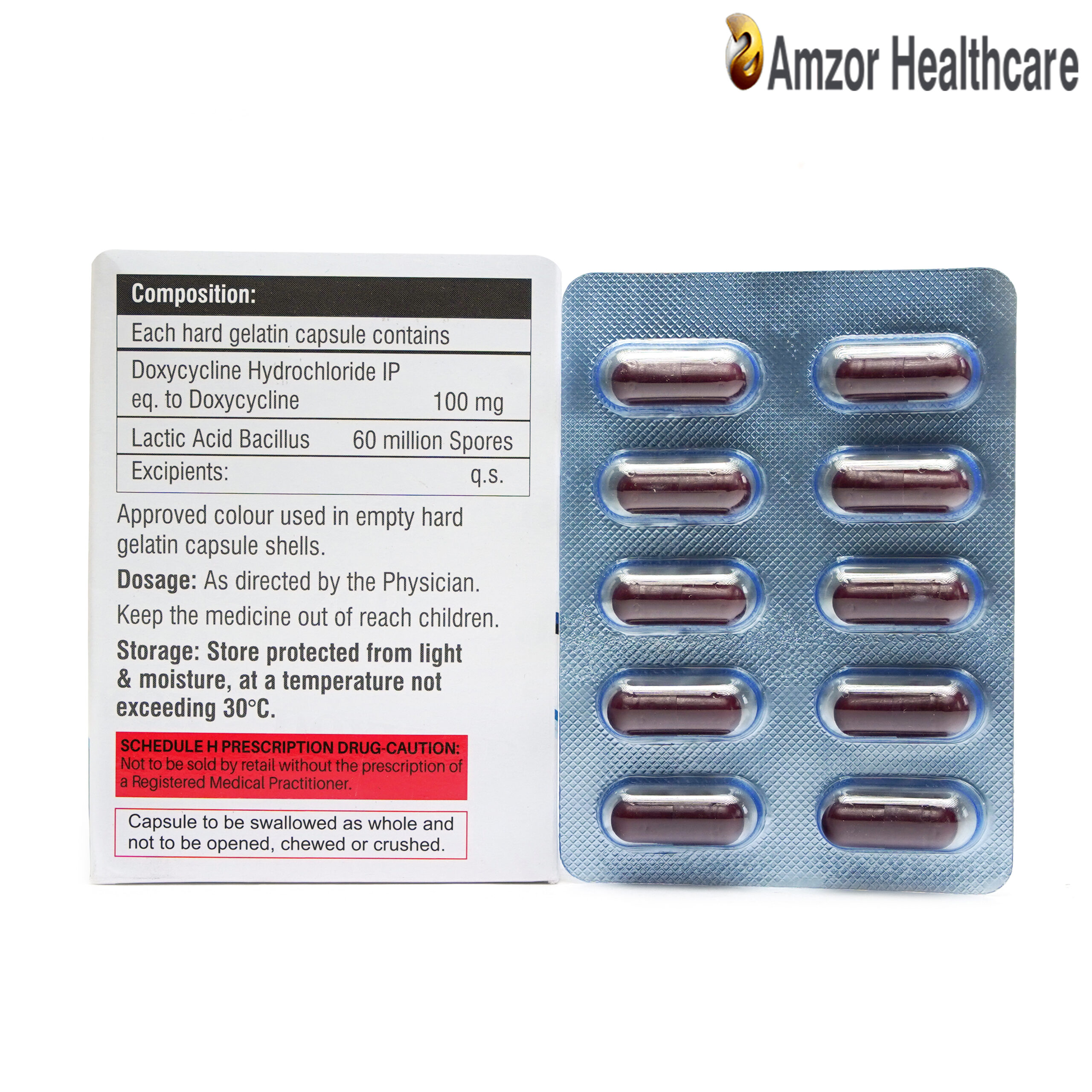COMPOSITION: Each hard gelatin capsule contains: Doxycycline Hydrochloride IP eq. to Doxycycline 100 mg + Lactic Acid Bacillus (60 million spores), Excipients q.s.