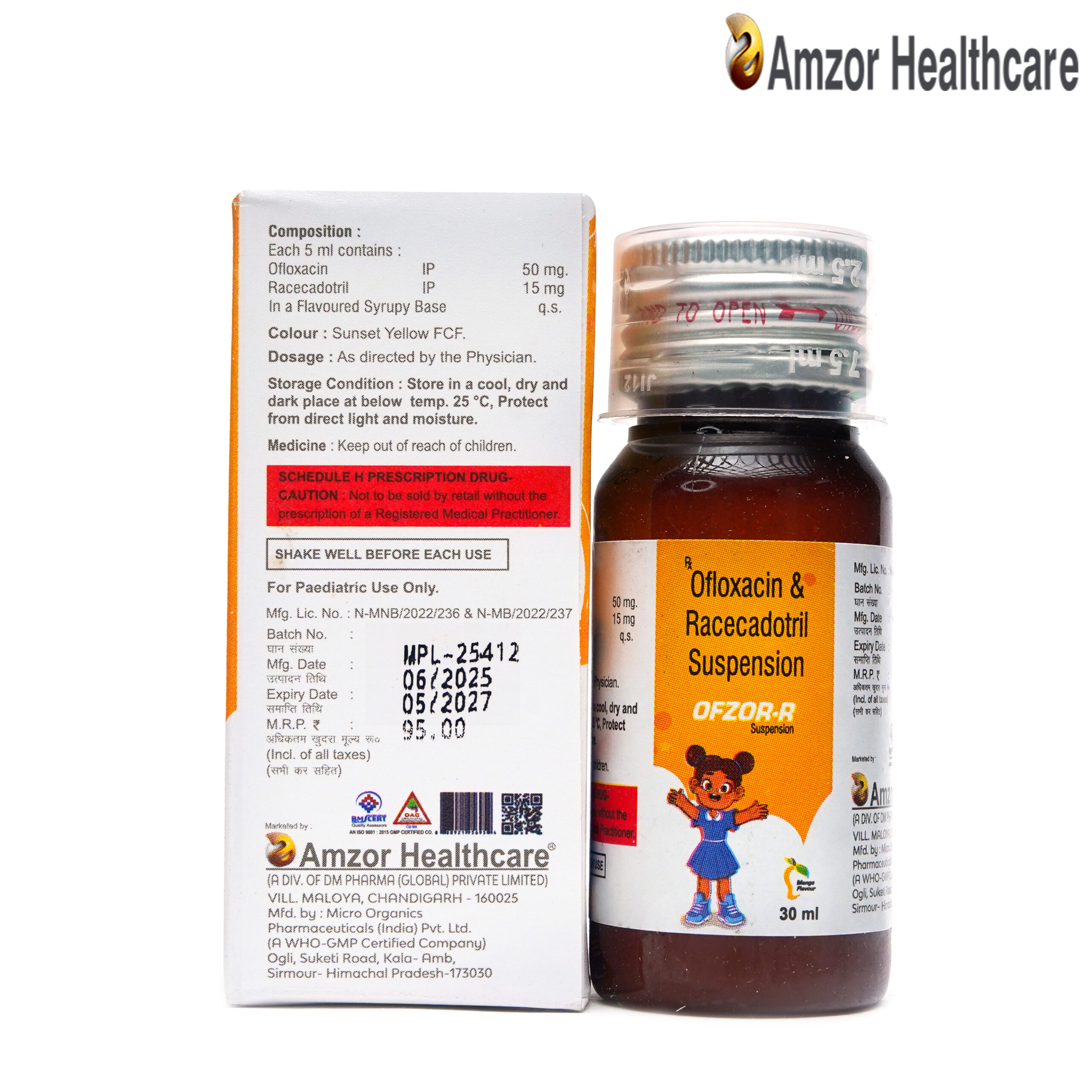 | OFZOR-R | Ofloxacin 50mg + Racecadotril 15mg per 5ml | 30 ml Bottle | Bottle with Mono Carton | – |